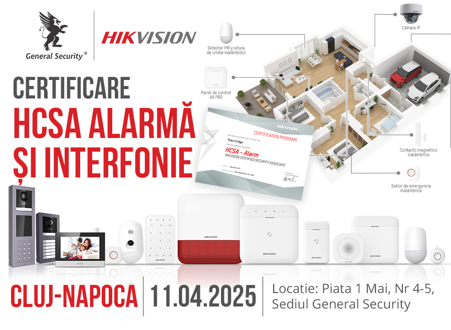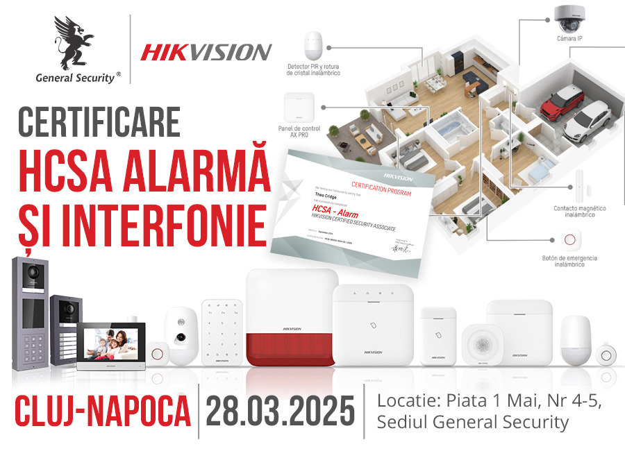 Avem plăcerea de a vă invita să participați la evenimentul de certificare HCSA - Alarmă și Interfonie Hikvision, organizat de General Security, care va avea loc pe 15 noiembrie 2024, la sediul General Security din Brașov, Str. Mică nr. 9.