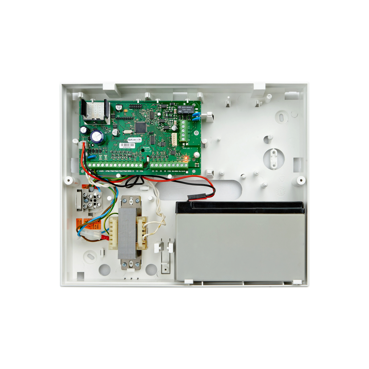 - Sistem de alarma 16 zone pe placa, 3 partitii, 5 tipuri de legare a detectorilor, BUS Technology, 5 PGM, posibilitate de conectare a detectorilor de fum pe 2 fire direct pe PGM 4, suporta 30 de divice conectate direct pe BUS, tastatura de service, memorie de 1024 evenimente, incorporat comunicator telefonic, posibilitate de programare a 2 numere de telefon, programare directa cu softul, programare remote prin aplicatia web AJAX SP PRO ProsTE; certificata EN50131 GRADE2, alimentare 230V ± 10%; cutie, transformator si bloc de siguranta inclus.