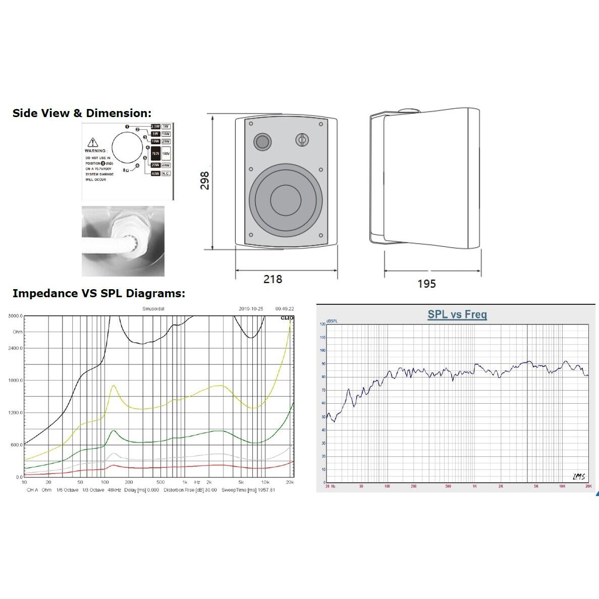 Difuzor 6.5" 2way waterproof IPC66 de montat pe perete 40W/20W/10W/5W 8Ω, intrare 100V sau 70V & 8Ω, Frequency Response 100-20KHz, SPL(@1W/m) 88±3dB, dimensiuni 298×218×195mm, carcasa ABS de culoare neagra cu grila de aluminiu