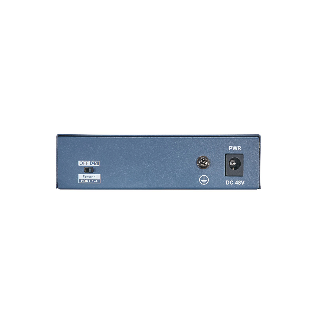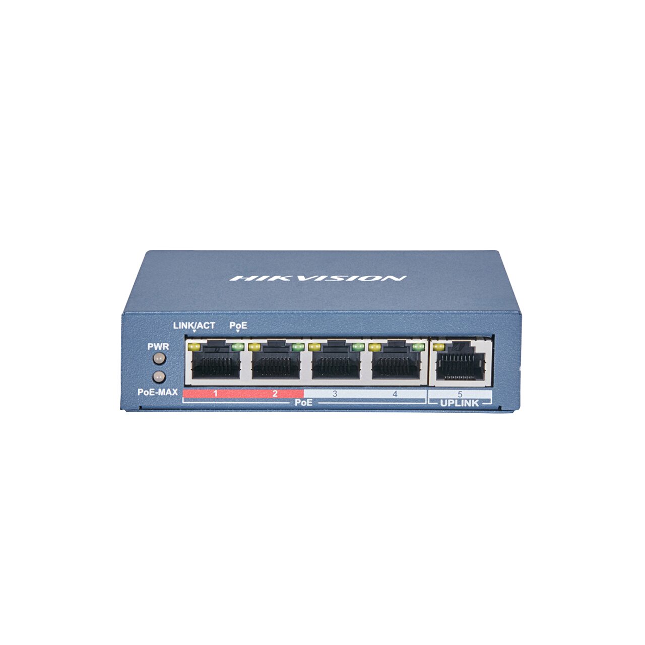 Switch 4 porturi EXTENDED POE 10/100Mbps RJ45 ports, 1uplink 100M Ethernet Port : transmite alimentare POE (IEEE 802.3, 802.3u, 802.3x, 802.3af, 802.3at) si receptioneaza date prin cablu UTP Cat5 la 200 metri catre camere IP Hikvision (Extended mode ON, recomandam limitarea traficului camerei la 6144Kbps); maximum 30W/port, total maxim/switch 58W); dimensiuni 235mm x103mm x27mm; temperatura de functionare 0℃-40℃