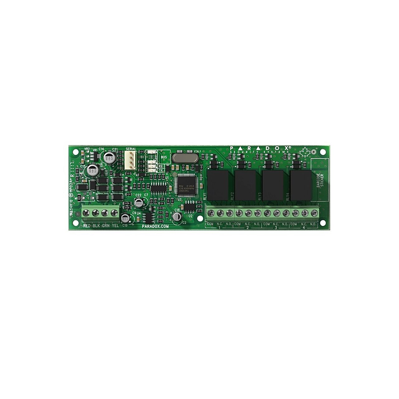 - Modul de extensie, 4 ieşiri PGM; compatibilitate: SP, MG şi EVO; 4 ieşiri de releu (5A) programabile; activarea sau dezactivarea PGM-ului se realizează în funcţie de eveniment, temporizat, continuu sau pulsatoriu în cazul alarmelor de incendiu.