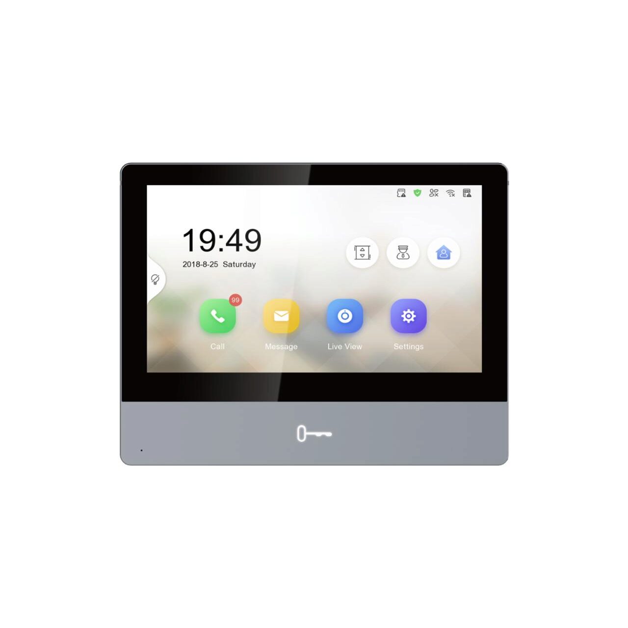 - Post interior VideoInterfon IP: 7" IPS touchscreen color LCD rezolutie 1024x600 pixeli, microfon, carcasa slim din aluminiu "Aviation grade", difuzor, RJ-45 10M/100M Self-Adaptive Ethernet Interface IEEE802.3af, standard PoE, Wi-Fi 802.11 b/g/n, card slot up to 32GB, Alarm I/O 8/2, RS485, alimentare 12Vcc/1A sau POE IEEE802.3af, dimensiuni 180 mm × 140 mm × 22.4 mm.