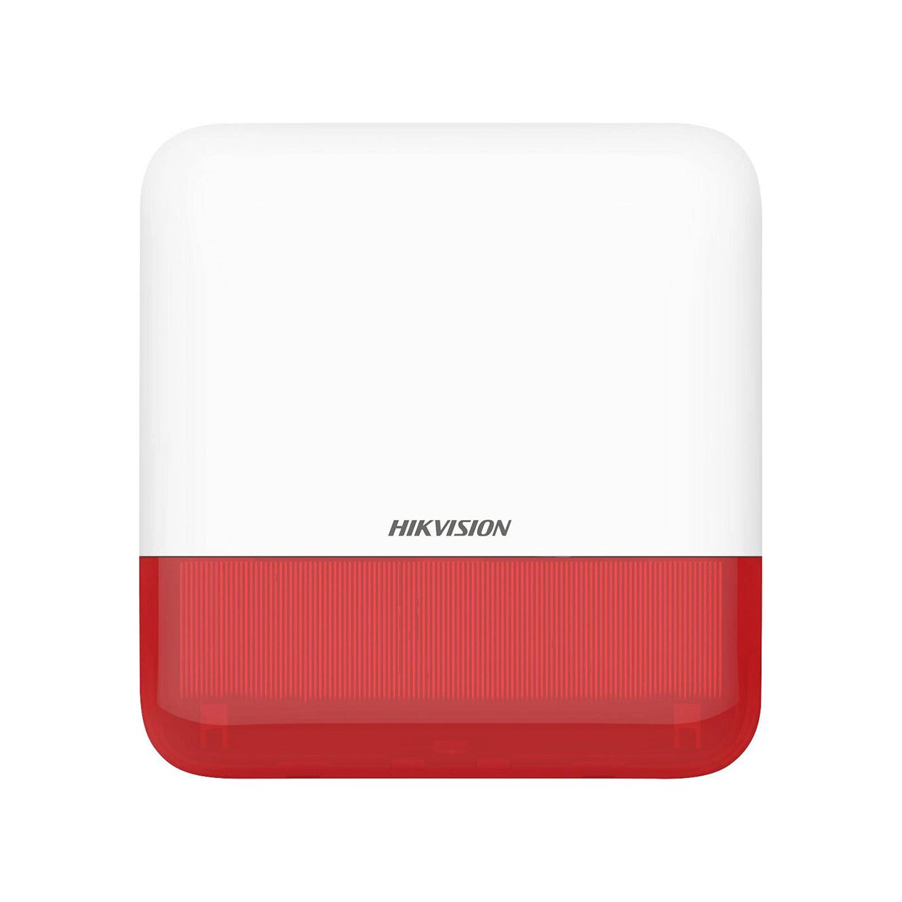 - Sirena wireless cu stroboscop de culoare rosie HIKVISION pentru centralele HIKVISION AX PRO, comunicatie radio bidirectionala , Tri-X 868 MHz anti jamming cu salt in frecventa , 3 ani autonomie de functionare pentru baterie, (1 alarma 90 secunde la 2 saptamani), Buzzer 110 dB (3 feluri de alarma incendiu, panica, intrusion alarm), tamper, distanta de comunicatie in camp deschis 1.6 km, alimentare 12Vcc sau baterie 4 x CR123A, dimensiuni 190× 200 × 47. 3mm, greutate 606 grame, carcasa din material plastic ABS, grad de protectie la intemperii IP 65, pentru utilizare la exterior; functioneaza in gama de temperaturi -20C pana la +60 C.