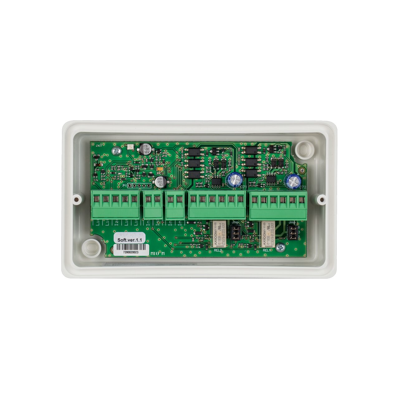 - Modul adresabil 2 IN / 2 OUT de tip releu cu maxim DC 30V/1A sau AC 125V/0.5A, contine izolator bucla, certificare EN54-18 si EN54-17, se alimenteaza direct din bucla, contine carcasa, protectie IP21C, protocol TTE.