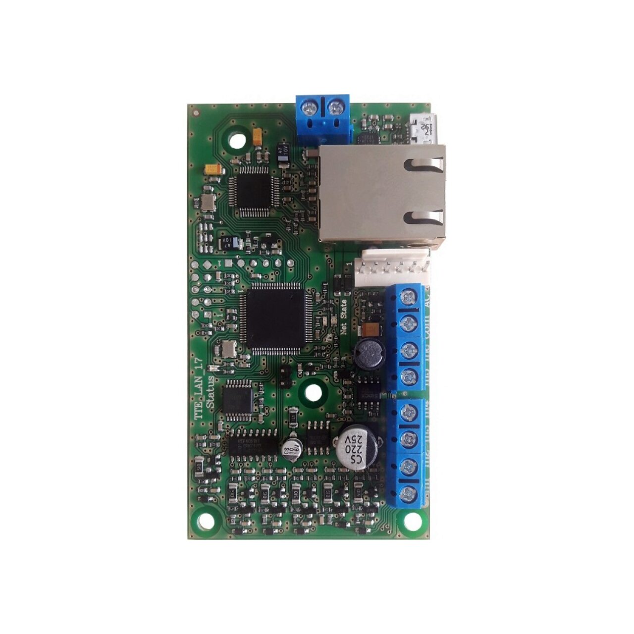 - Modul universal LAN (TCP-IP). 6 intrari / iesiri programabile. Port micro USB pentru programare (folosind softul ProsTE). Include conector pentru comunicatie cu centrala SIMPO. Se utilizeaza pentru comunicatia centralelor SIMPO cu softul de monitorizare OBSERVER.