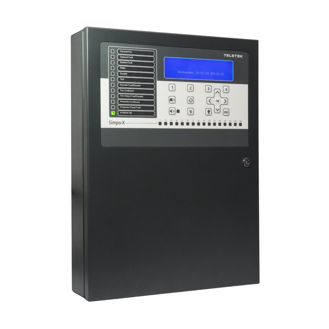 - SIMPO X este centrala ideală pentru instalațiile de dimensiuni mici și medii. Suportă 1 buclă integrată și posibilitatea de extindere la 2 bucle, fiecare având capacitatea de a conecta până la 250 de dispozitive (detectoare și module). Sistemul permite 48 de zone și 9 grupuri configurabile, iar starea acestuia este afișată pe un ecran LCD cu indicatori LED.