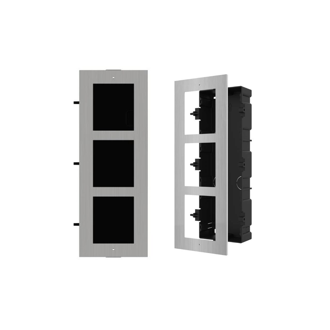 - Carcasa cu doza pentru montaj ingropat din otel inoxidabil pentru montaj pentru 3 module VideoIntercom; dimensiuni doza (plastic) 338.8 × 135 × 56 mm, dimensiuni carcasa (otel inoxidabil) 337.8 x 124 × 4 mm.