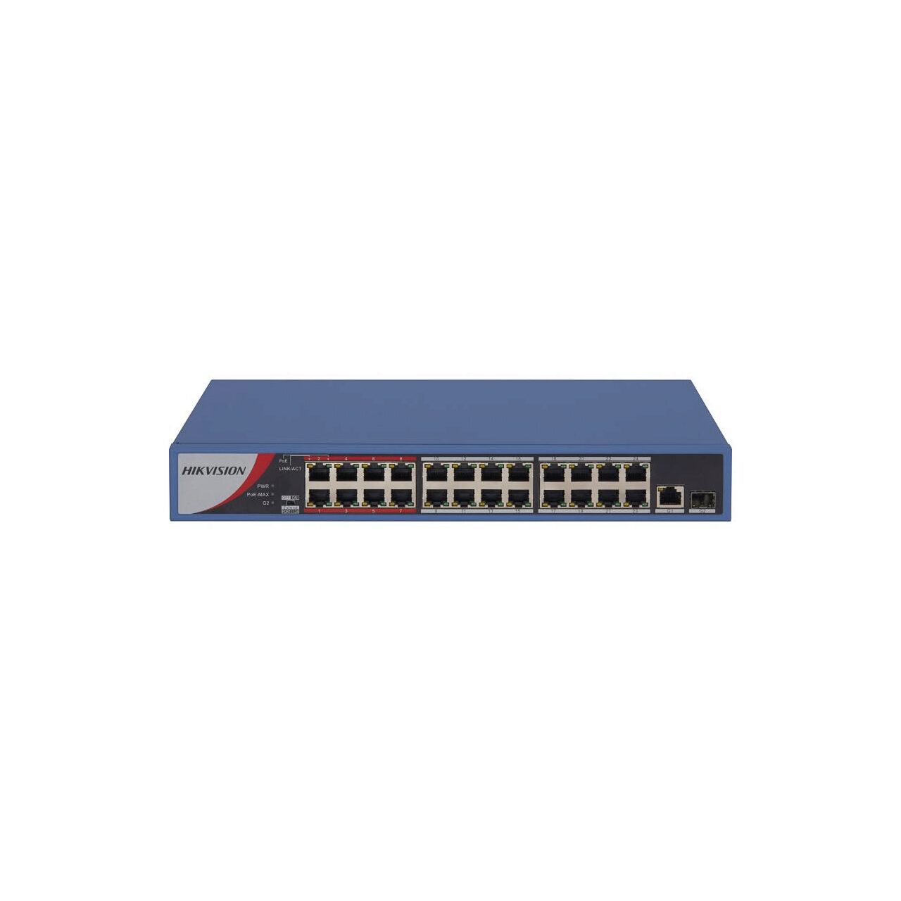 - Switch Layer 2 24 porturi POE 10/100Mbps RJ45 ports, 1x 1000Mbps RJ45 port, 1 × 1000 Mbps SFP fiber optical port, transmite alimentare POE ( IEEE 802.3af/at) si receptioneaza date prin cablu UTP Cat5 la 200 metri de la camere IP Hikvision (porturile 17-24 Extended PoE), maximum 30W/port, High priority ports 1-8, total maxim PoE/switch 230W); recomandam limitarea traficului camerei la 6144Kbps); MAC address table 4 K, 8.8 Gbps Switching, 6 kV Surge Protection, dimensiuni 335 mm × 44.5 mm × 226 mm; greutate 3.3 kg, temperatura de functionare -10℃-55℃, carcasa metalica.