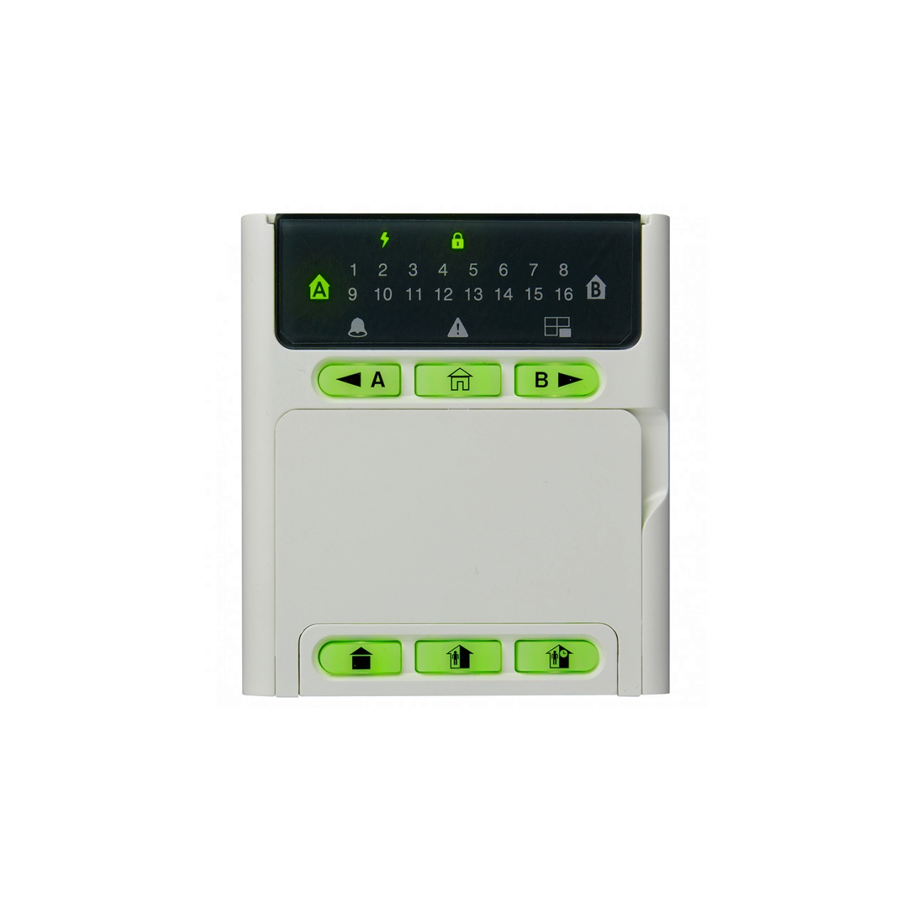- Tastatura LED, 2 partitii si 16 indicatoare de zona, 1 zona programabila, 3 combinatii de butoane pentru functii rapide FOC, MEDICAL si PANICA cu transmiterea mesajului in dispecerat indicator de starea sistemului - probleme si memoria de evenimente, indicator special pentru tipul starii de armare a sistemului. Posibilitate de programare din tastatura.