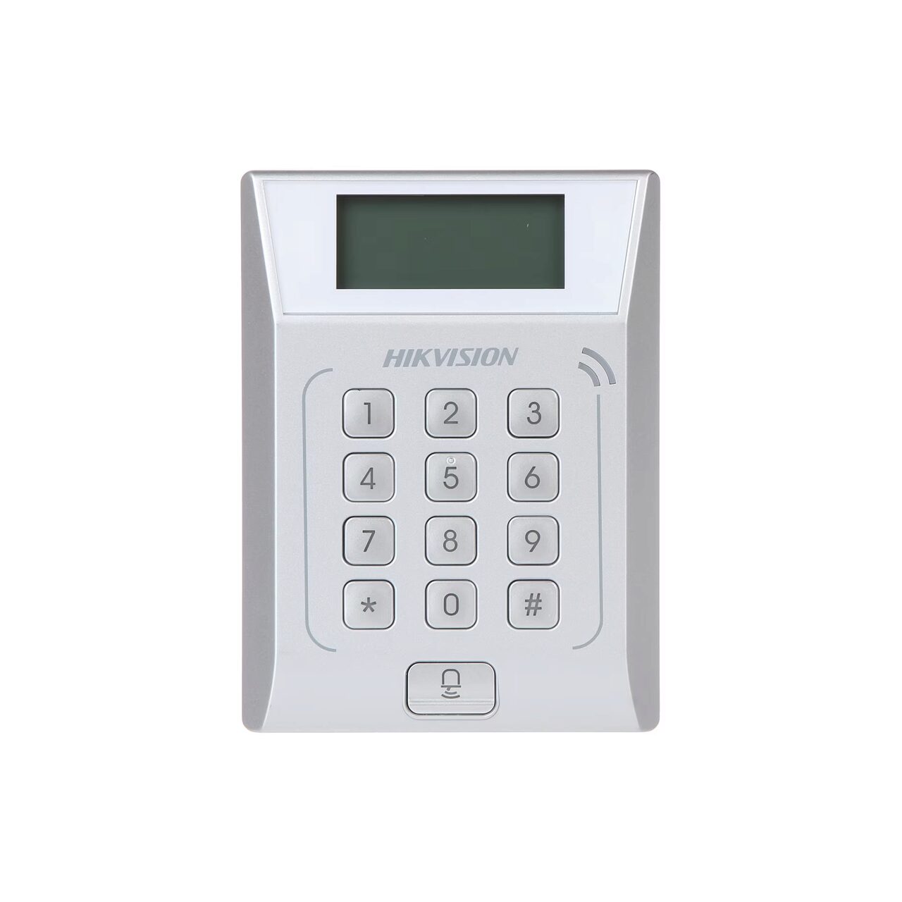 - Unitate control acces standalone compusa din cititor de proximitate Mifare si tastatura, display LCD 128x64 pixeli, capacitate 3000 cartele in regim STAND ALONE, memorie de 10000 tranzactii, editare din PC cu aplicatia software gratuita Hikvision iVMS4200, indicator Status LED, intrare Exit buton, intrare pt Contact magnetic, intrare comanda Exit buton, iesire sonerie, iesire comanda usa, tastatura cu 13 taste, mod acces pe cartela, 1X RJ45 10M/100M Ethernet port (TCP/IP network communication. Alimentare 12Vcc, operare -20C pana la +65C, dimensiuni 126.5(L)mm×94.5(W)mm×24(H)mm; pentru utilizare la interior.