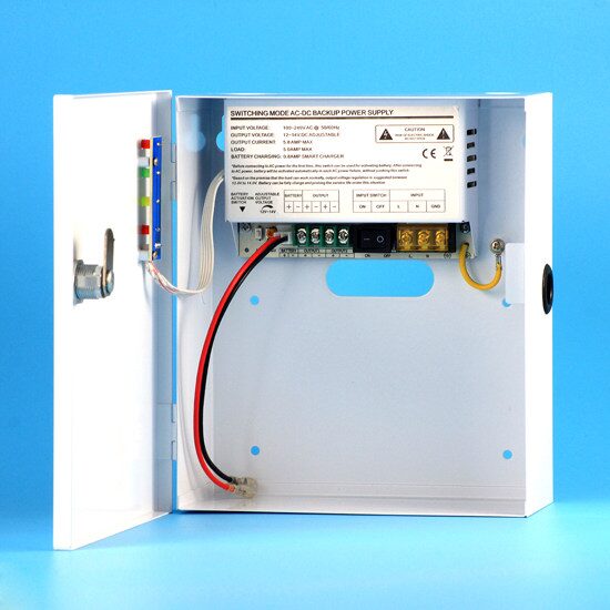 Sursa de alimentare in comutatie cu backup in cutie metalica, iesire baterie backup ajustabila 12-14Vcc 5A, tensiune intrare AC 90-260V, 50~60HZ; Indicator alimentare, iesire, incarcare si indicator ALARMA LOW Battery pentru a fi utilizata cu acumulator 12V/7Ah, ALARMA LOW Battery; Dimensiuni:195 x 225 x 83mm, temperaturi de operare -20C pana la +60C.