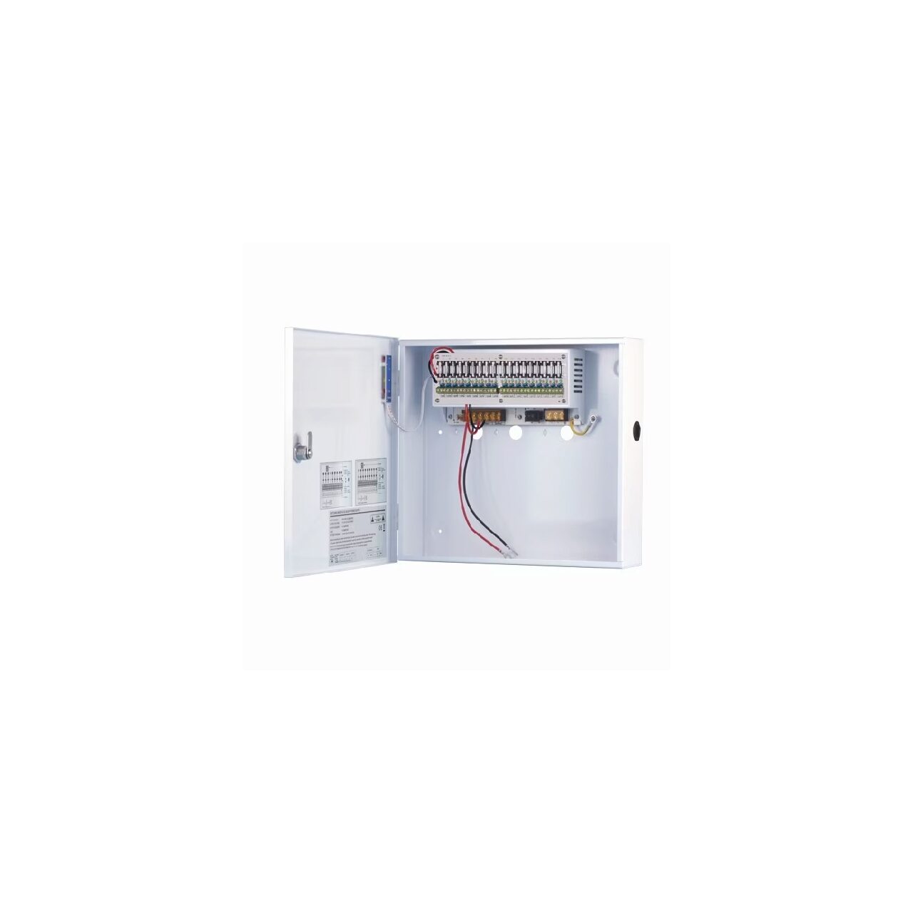 charge indicator, Battery undervoltage indicator) iesire baterie backup 12-14Vcc, 10A, tensiune intrare AC 100-240V, 50~60HZ, tensiune iesire ajustabila 12-14Vcc, 18 iesiri, curent de iesire total 10A, pentru a fi utilizata cu acumulator 12V/17Ah, Indicator alimentare, iesire, incarcare baterie, indicator led interior pentru fiecare iesire. NU INCLUDE ACUMULATOR; Dimensiuni:285*285*125mm.