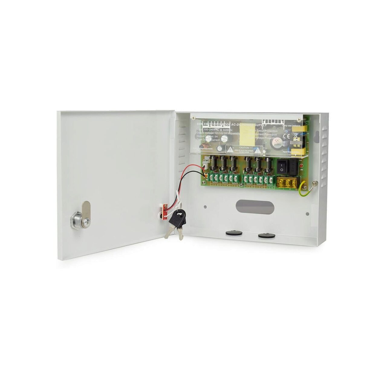 Sursa de alimentare in comutatie cu cutie, pentru camere video, tensiune intrare AC 90-260V, 50~60HZ, tensiune iesire DC 12-14V(ajustabila)curent de iesire 9X 0.55A, total 5A dimensiune L*W*H 200*160*50MM.